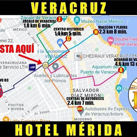 Hotel położony jest około 10 km od lotniska General Heriberto Jara i 25 min piechotą od takich miejsc kulturalnych jak Zamek San Juan de Ulúa. Muzeum Bastion of Santiago znajduje się w niewielkiej odległości od tego obiektu noclegowego. Mercado undad veracruzana leży w kilku minutach spacerem. Hotel Merida jest usytuowany 10 min pieszo od dworca autobusowego Turismo en Omni SA de CV.